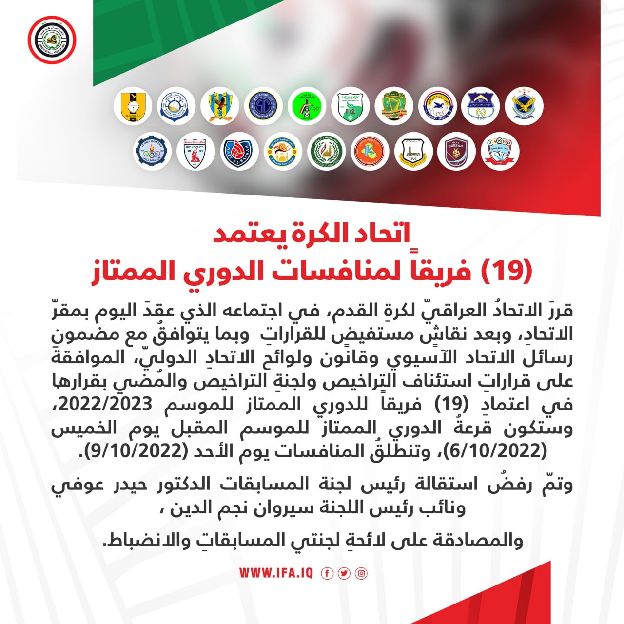 قررَ الاتحادُ العراقيّ لكرةِ القدم، في اجتماعه الذي عقدَ اليوم بمقرّ الاتحادِ، وبعد نقاشٍ مستفيضٍ للقراراتِ وبما يتوافقُ مع مضمونِ رسائل الاتحاد الآسيوي وقانون ولوائح الاتحادِ الدوليّ، الموافقةَ على قراراتِ استئناف التراخيص ولجنةِ التراخيص والمُضي بقرارها في اعتمادِ (١٩) فريقاً للدوري الممتاز للموسم ٢٠٢٣/٢٠٢٢، وستكون قرعةُ الدوري الممتاز للموسم المقبل يوم الخميس (٢٠٢٢/١٠/٦)، وتنطلقُ المنافسات يوم الأحد (٢٠٢٢/١٠/٩).