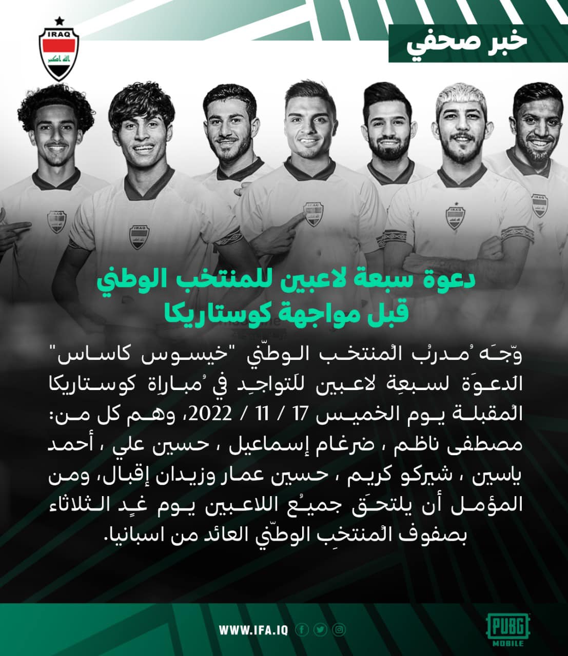 استدعى المدير الفني الجديد للمنتخب العراقي، خيسوس كاساس، 7 لاعبين للتواجد في المباراة الودية أمام كوستاريكا، المقررة على ملعب البصرة الدولي الخميس المقبل.